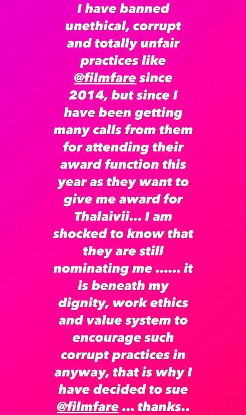 “I’ve banned unethical, corrupt and totally unfair practices like @filmfare since 2014, but since I have been getting many calls from them for attending their award function this year as they want to give me award for Thalaivii… I am shocked to know that they are still nominating me. It is beneath my dignity, work ethics and value system to encourage such corrupt practices in anyway, that is why I have decided to sue @filmfare … thanks..”
