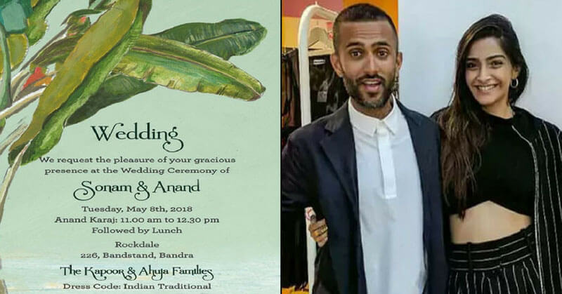 According to the sources, Sonam and Anand decided to send e-invitations to their guests. Choosing the invitation cards, Sonam Kapoor opted for simple designs. Two different styles of cards have been shared, as the wedding encompasses multiple events including, Mehandi (7 May 2018), Sangeet (at the night of 7 May), Wedding (8 May 2018) and after that the reception.